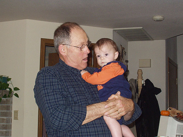 Exhausted baby boy in Grandpa's arms.